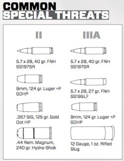 In some cases, these Special Threat declarations can be quite significant. For example, our armour manufacturer, Armor Express, has Level II armour that passes NIJ but will also stop Level IIIA rounds (see image on right). This means that you can buy Level II armour but have the same protection that a IIIA vest would offer. Of course, a IIIA will offer more protection because Armor Express also has Special Threats listed for IIIA armour, which includes a rifled shotgun slug.